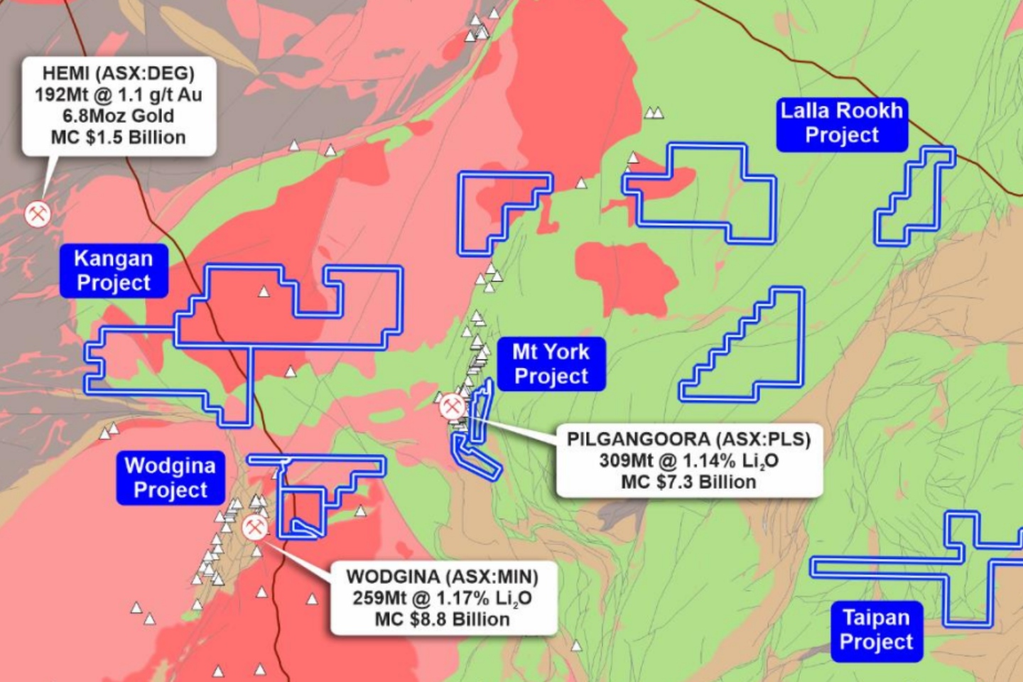 Pilbara Minerals, with a market cap north of $8 billion, sits to the east of Kairos’ Wodgina project and has defined a 309 million tonne resource grading 1.14 per cent lithium oxide at its producing Pilgangoora lithium-tantalum mine.